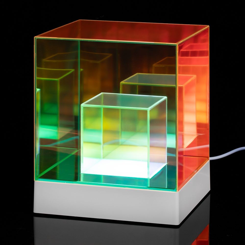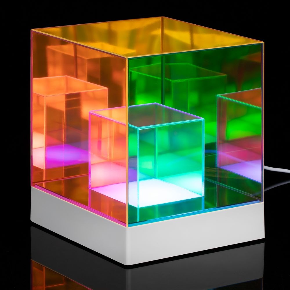 Cubini — интерьерный светильник с разноцветной подсветкой и удивительным оптическим эффектом. Разные оттенки граней и их множественные отражения мгновенно притягивают взгляд, заставляя рассматривать кубик снова и снова.Светильник можно использовать как ночную лампу или объект дизайна в интерьере. Яркость и тип подсветки регулируются при помощи пульта управления на кабеле.
