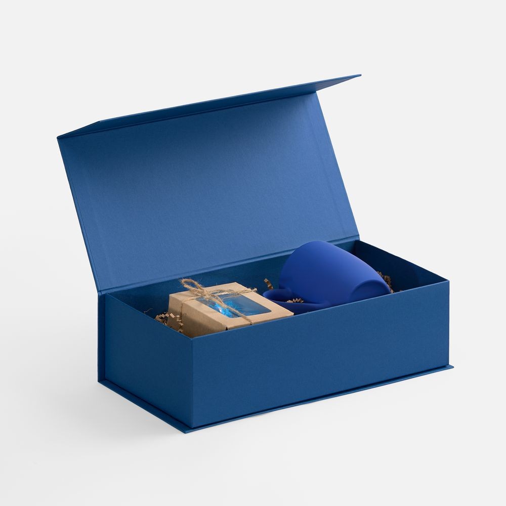Коробка изготовлена из переплетного картона, кашированного гладкой дизайнерской бумагой Malmero, с крышкой на магните.Конструкция коробки предусматривает наличие технологического зазора шириной до 2 мм по линии сопряжения короба и крышки.