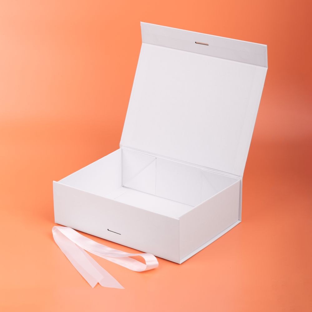 Коробка из переплетного картона, кашированного тонированной в массе крафтовой бумагой. Крышка на двух магнитах дополнительно фиксируется репсовой лентой.Толщина картона 2 мм.