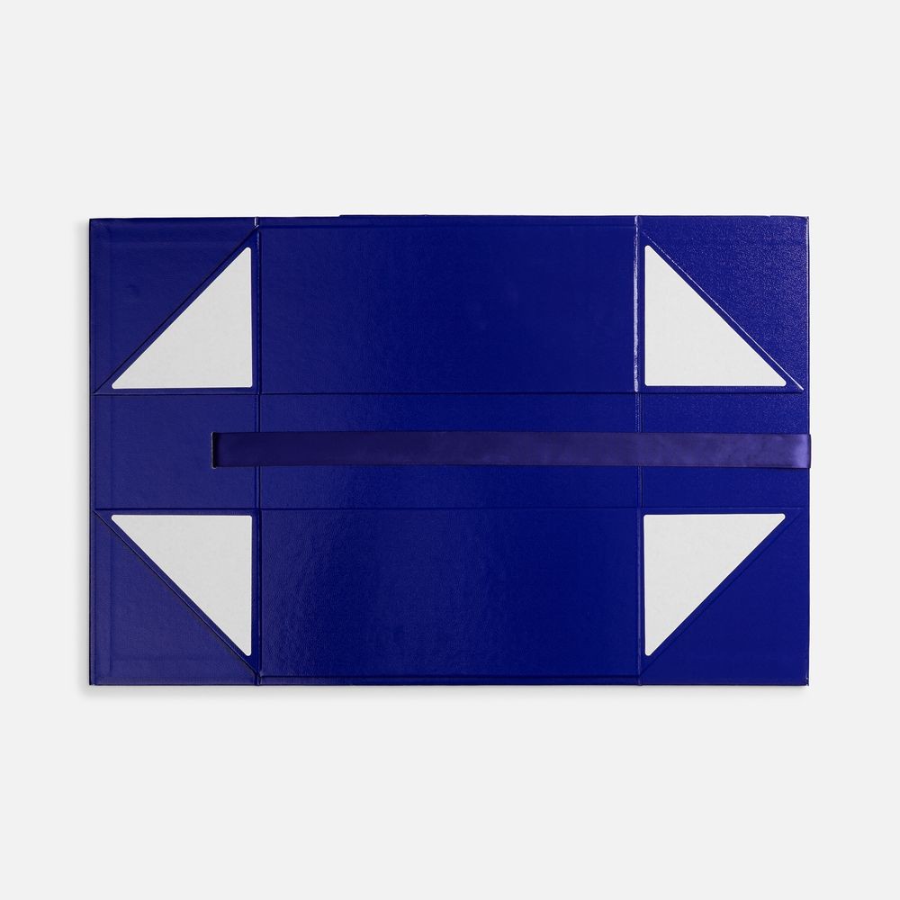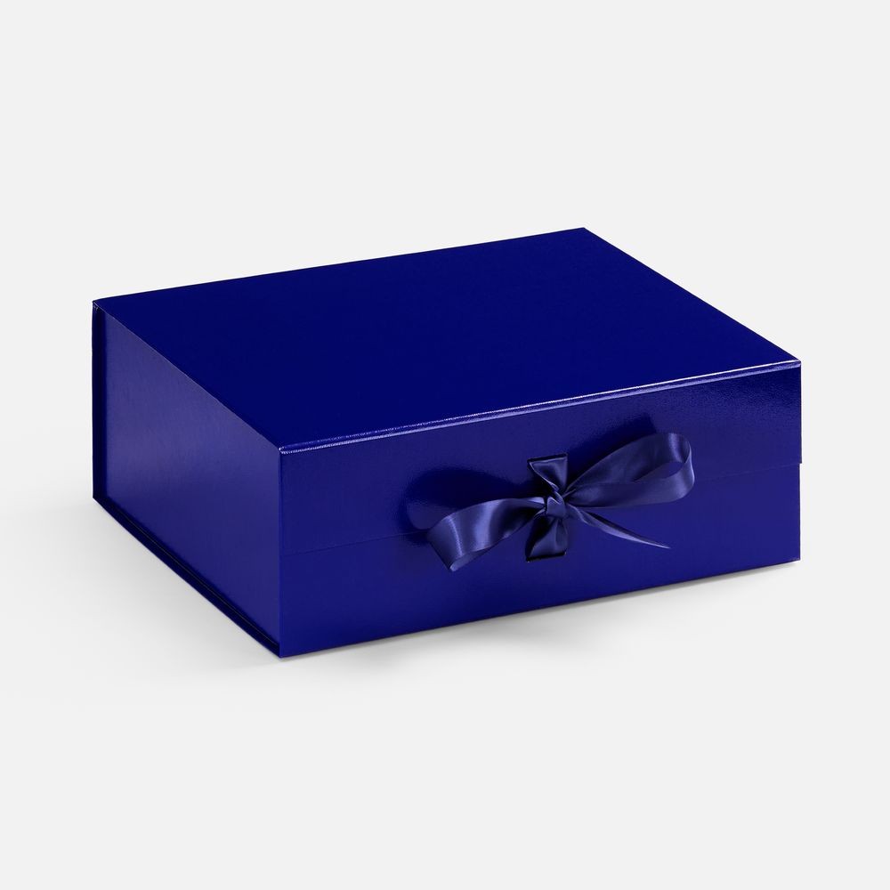 Коробка из переплетного картона с лайнером, ламинированым полуглянцевой текстурной пленкой и устойчивого к царапинам. Крышка на двух магнитах дополнительно фиксируется репсовой лентой.Толщина картона 2 мм. Поставляется в плоском виде. Сборка осуществляется на скотч.Лента поставляется в сложенном виде и имеет складки на местах сгибов.
