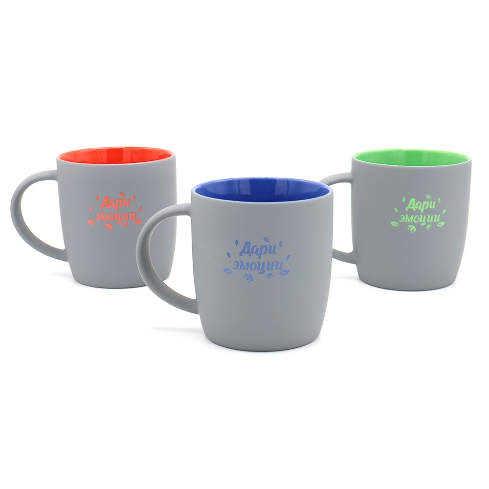В кружке Spring под покрытием софт-тач слоя нанесен слой глазури такого же цвета, что и внутри; и при гравировке вы получаете яркое цветное изображение.