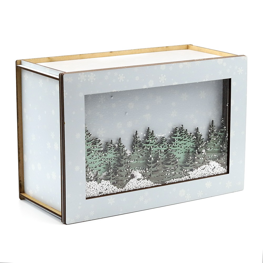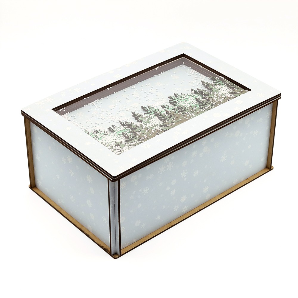 Новогодняя упаковка "Лес в снегу" — это прямоугольная деревянная коробка светлого голубого цвета с полуматовым покрытием, оформленная в зимнем лесном стиле с изображением снежных деревьев. Её лёгкий и изысканный дизайн создает атмосферу зимнего волшебства, идеально подходя для хранения подарков или сладостей. Отличается утонченным внешним видом и приносит праздничное настроение в новогодние праздники.
