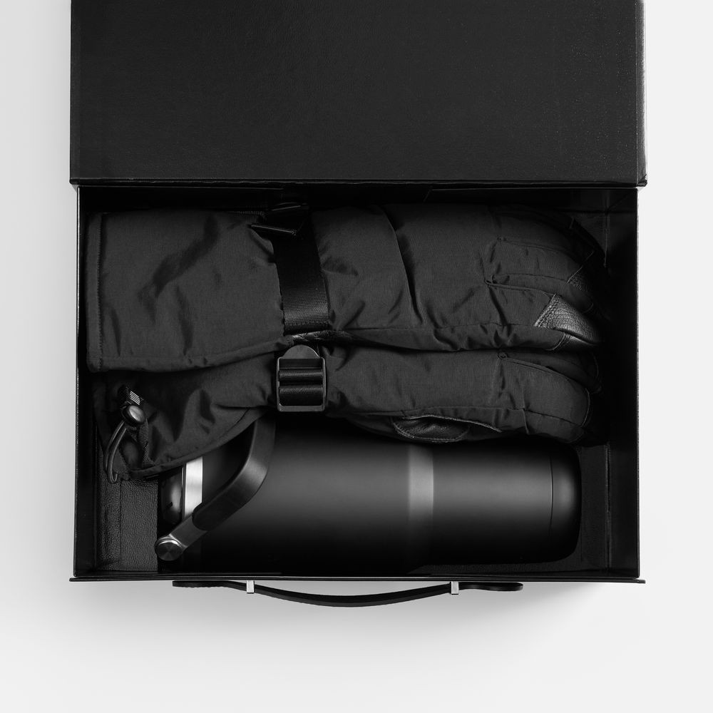 Материал: варежки - полиэстер 100%, утеплитель - 3M Thinsulate, плотность 100 г/м²; вставки - натуральная кожа; внешняя стенка термостакана - нержавеющая сталь, 201, внутренняя стенка - 304; крышка - пластик; коробка - переплетный картон; искусственная кожа