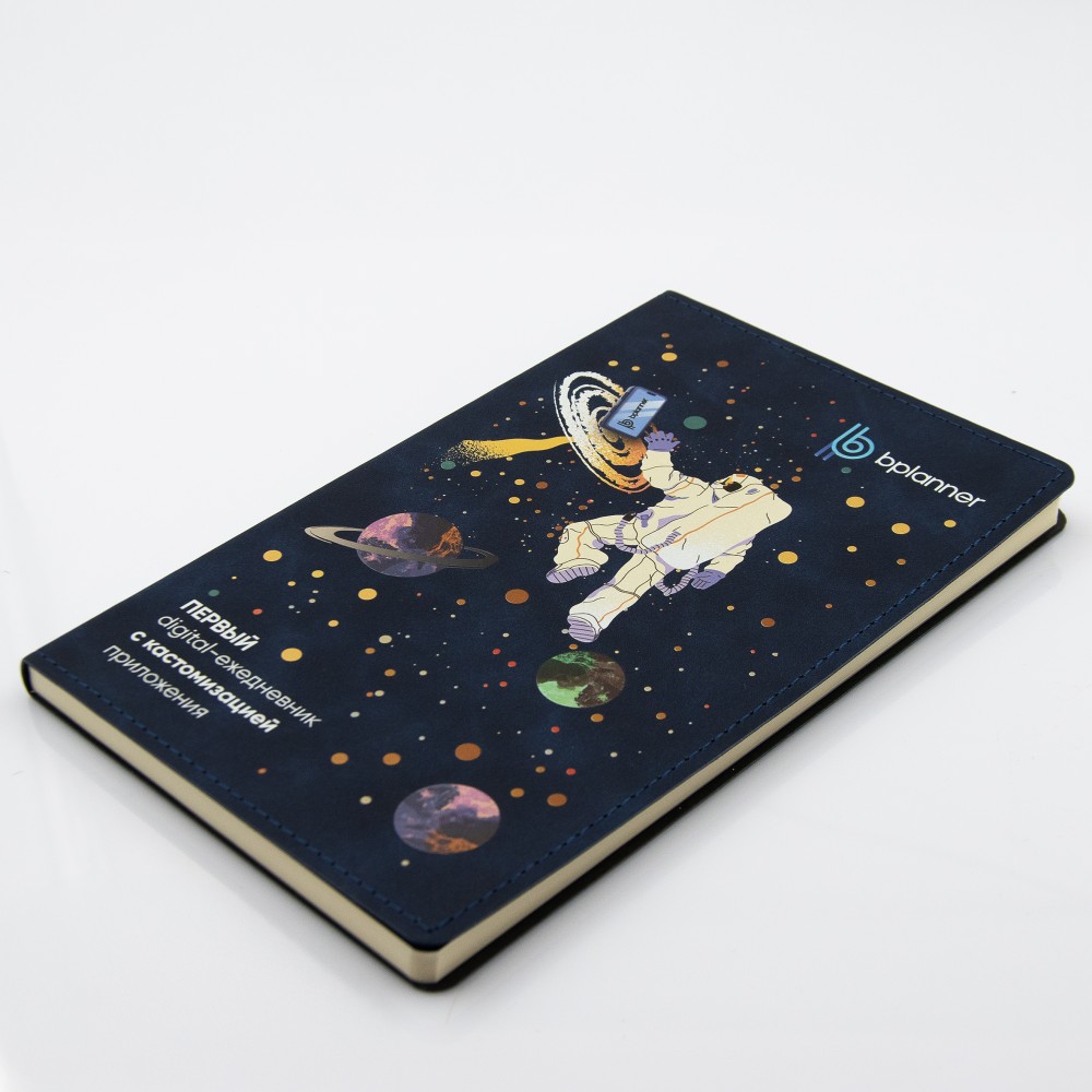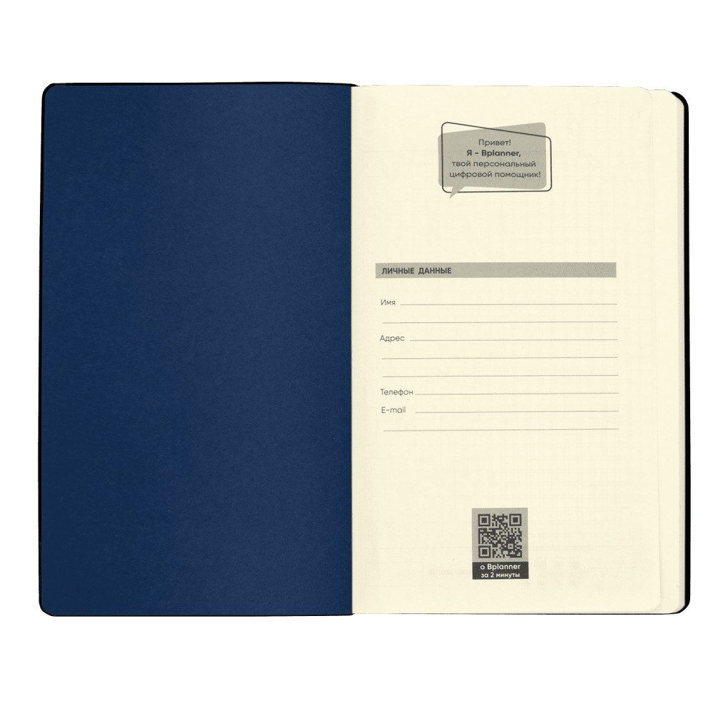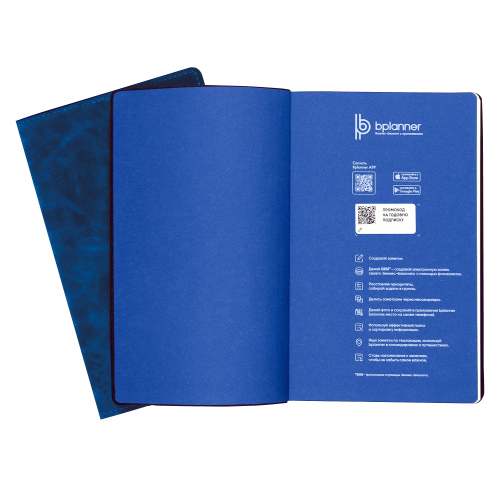 Бизнес-блокнот Bplanner. 05 — абсолютно новая модель в линейке Bplanner. Это бизнес-блокнот с недатированным тонированным блоком в клетку. Блок имеет ряд особенностей: наличие титульного листа с возможностью добавления личных данных и контактной информации, трекер воды и шагов на каждой странице и 3 разворота для заметок в конце блокнота. Обложка изготовлена из экокожи Nubuk-touch и имеет прострочку по краю в цвет материала. Фактура материала напоминает замшу или нубук. У блокнотов цветной форзац и нахзац. На форзаце расположен qr-код, который активирует годовой доступ к мобильному приложению. А приложение способно теперь еще и распознать и оцифровать текстовые заметки.