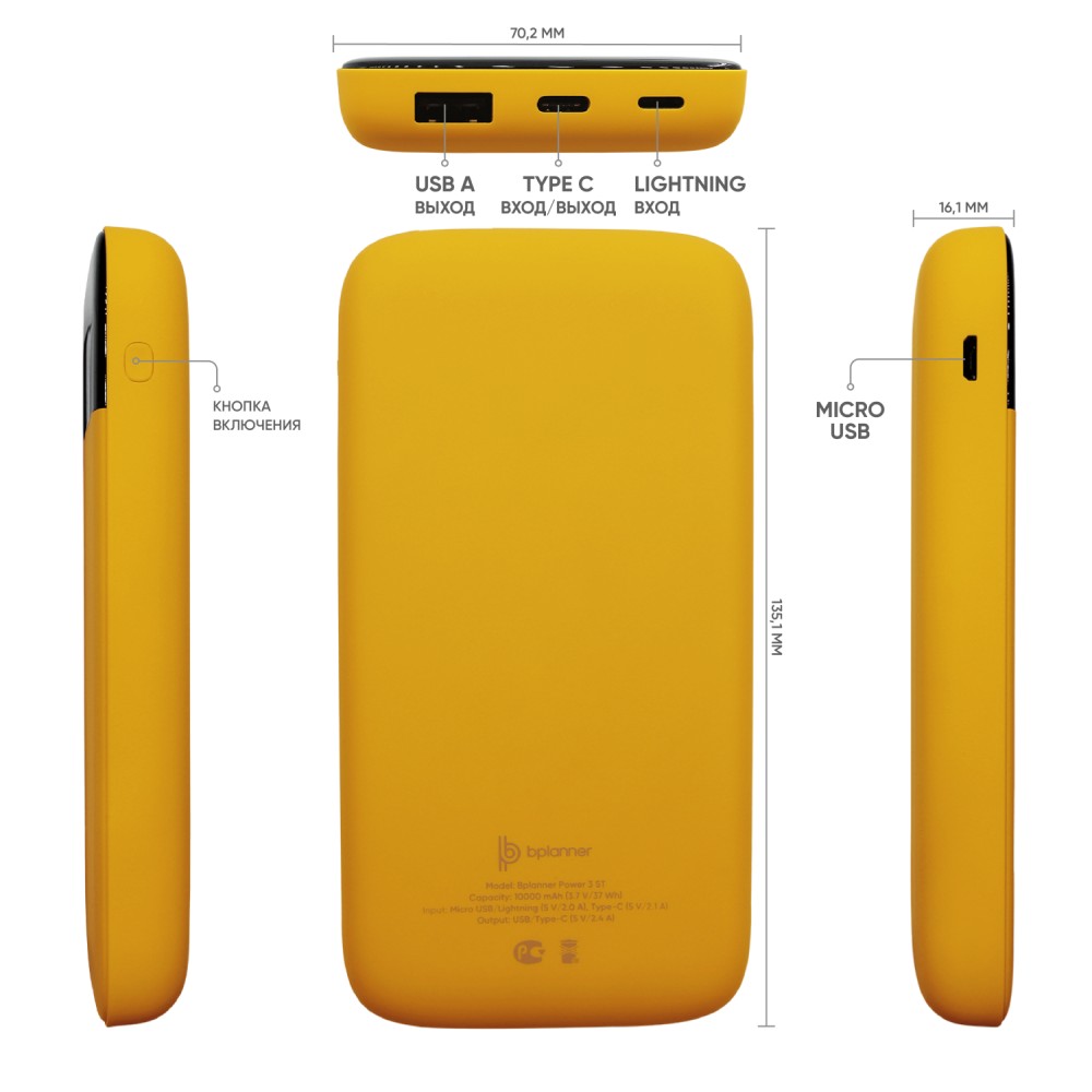 1. Внешний аккумулятор Bplanner Power – функциональное зарядное устройство, которое представлено в различных модификациях и может одновременно заряжать 2 гаджета. Аккумулятор оснащен индикатором заряда и входом Type-С. В комплекте идет кабель 3 в 1 и инструкция.
