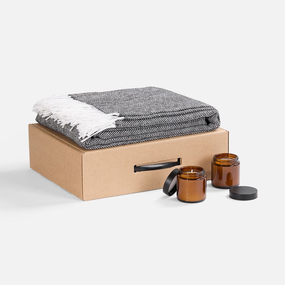 Материал: плед - шерсть, 15 %; хлопок, 5 %; полиэстер, 60 %; акрил, 20%, плотность 200 г/м²; подсвечник - стекло, крышка - пластик; свеча - парафин, соевый воск, парфюмерная композиция; коробка - микрогофрокартон, Т-23Е