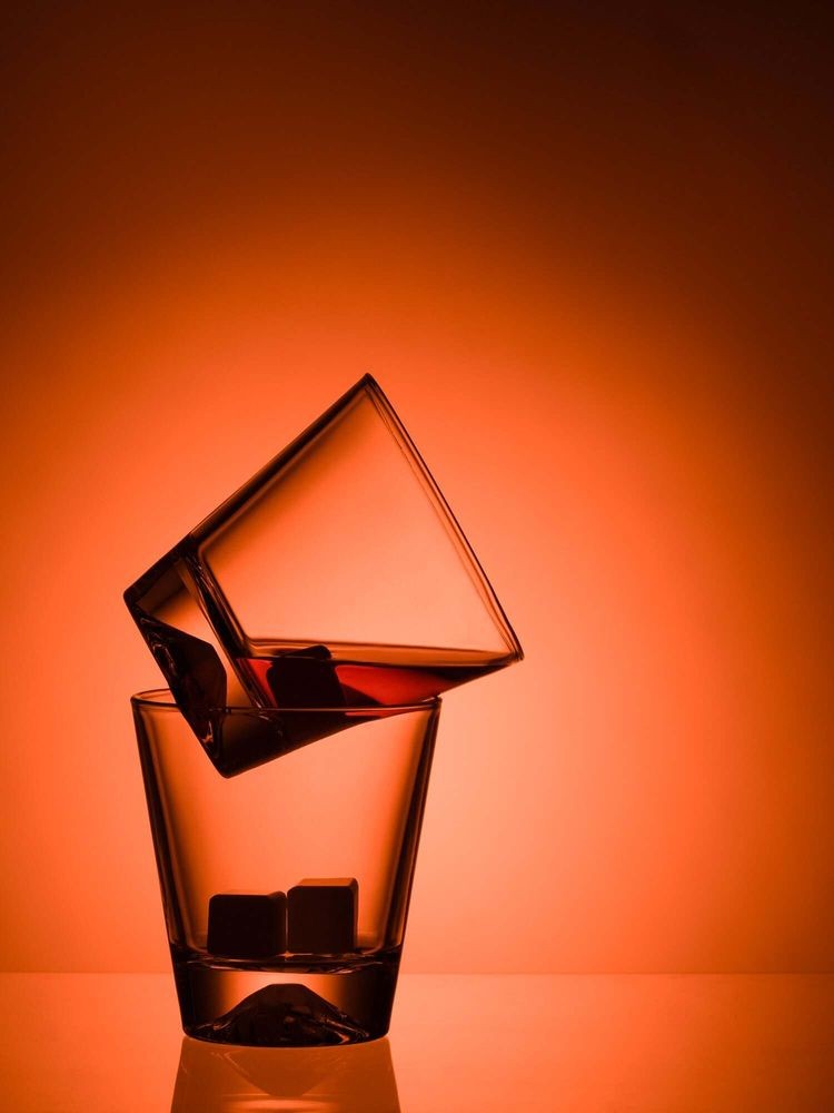 Дно бокалов выполнено таким образом, что кажется, будто в него заключена гора со снежной шапкой, а изготовленные из белого кварца камни для охлаждения напитка выглядят точь-в-точь как кубики льда.