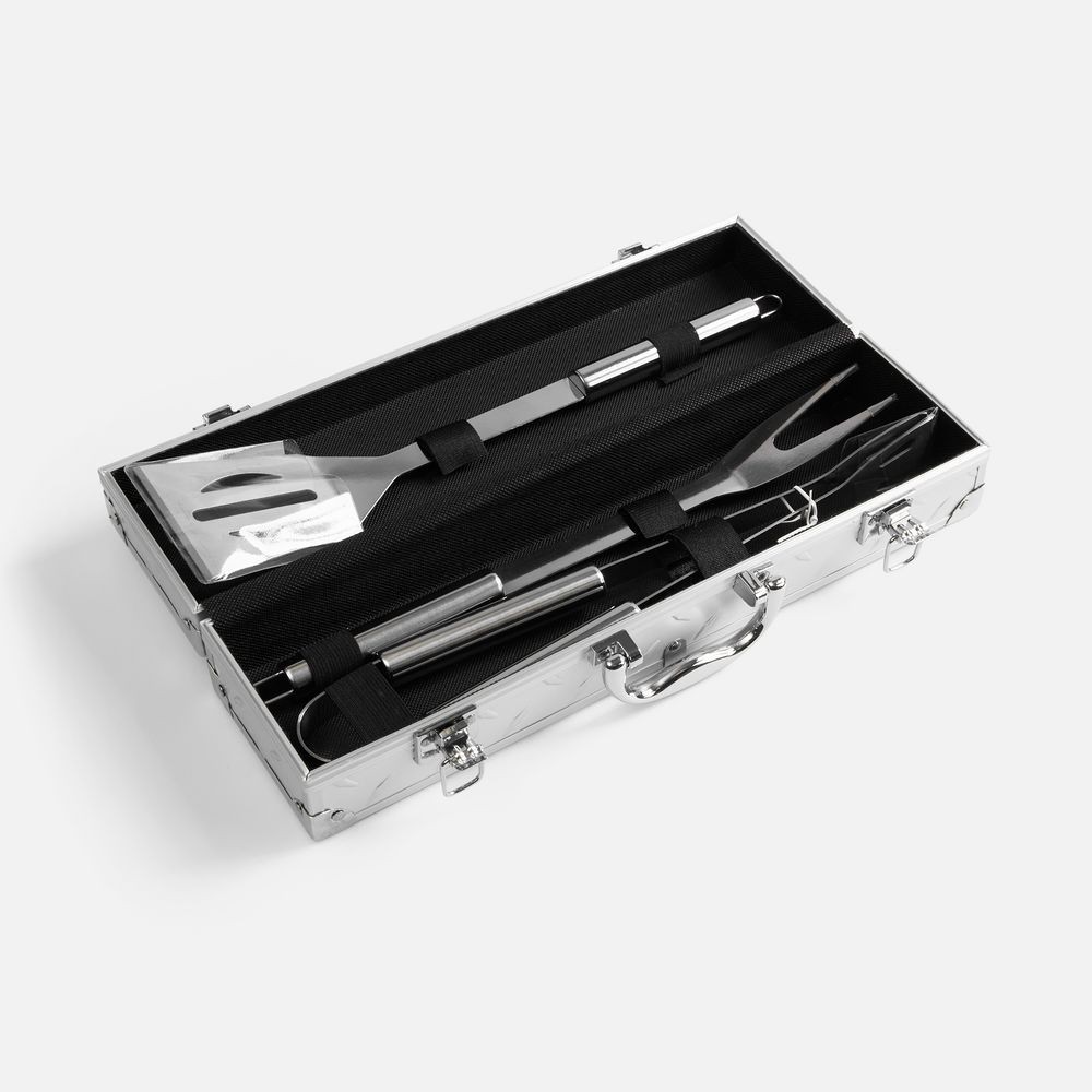 Размеры: вилка: 35,5х3,5х2 см; лопатка: 35,5х7,5х2 см; щипцы: 35х4,2х6 см; кейс: 37х10х8 см