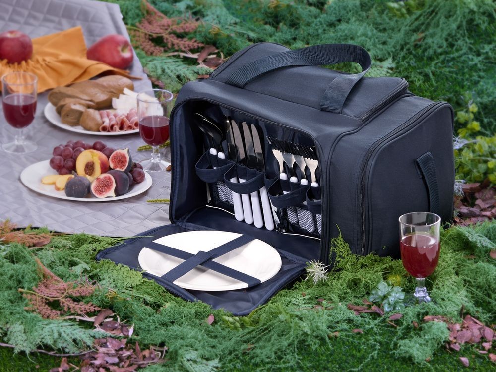 Материал: термосумка - полиэстер, плотность 230 г/м², PEVA; тарелки и бокалы - полистирол; приборы - нержавеющая сталь, пластик