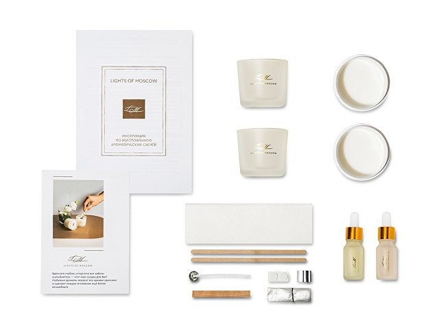 Уникальный набор для изготовления ароматических свечей станет приятным подарком и погрузит в увлекательный процесс. Набор выполнен в подарочной коробке с ложементом, в него входят все необходимые компоненты и подробная инструкция. Откройте для себя удивительный мир ароматов с Lights of Moscow! Вы сможете создать две невероятные композиции, которые точно понравятся Вам и Вашим близким! Условия хранения: — Свечи: +18…+24 °C, вдали от источников тепла, сквозняков и прямых солнечных лучей. — Рекомендуемая влажность — не более 50%. — Избегайте длительного воздействия яркого света. В комплекте: Подарочная брендированная коробка с ложементом - 1 шт. Стакан стеклянный матовый с тиснением логотипа LM 100 мл - 2 шт. Контейнер с соевым воском – 2 шт. Флакон стеклянный матовый c тиснением логотипа LM с ароматической отдушкой – 2 шт. Деревянный фитиль с держателем – 1 шт. Хлопковый фитиль с держателем - 1 шт. Наклейка для крепления фитиля - 2 шт. Палочка для перемешивания - 2 шт. Салфетка - 1 шт. Перчатка - 1 шт. Открытка - 1 шт. Инструкция по изготовлению ароматических свечей – 1 шт.