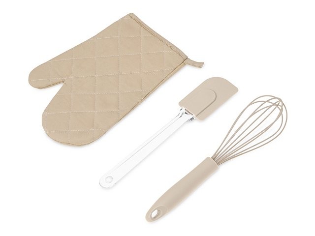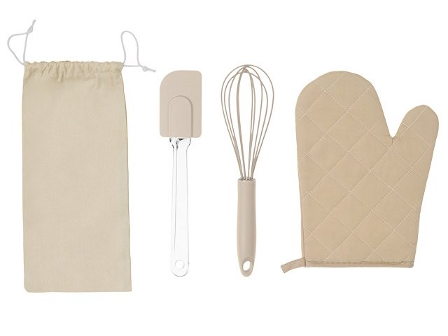 Набор Canele состоит из трёх предметов, без которых не обходится приготовление ни одного пирога или торта: венчика для взбивания яиц или крема, лопатки и прихватки для горячего. Силиконовая лопатка не царапает посуду, безопасна при нагревании, и к ней не прилипает тесто. Венчик также сверху покрыт силиконом, что позволяет его использовать с любыми ёмкостями, не боясь их повредить. Прихватка с одной стороны стёганая, а с другой абсолютно гладкая, благодаря чему на ней эффектно будет смотреться нанесённое изображение. Все предметы сложены в мешочек из неокрашенного хлопка, который также можно брендировать. • Функциональность • Лаконичный дизайн • Большая поверхность под нанесение