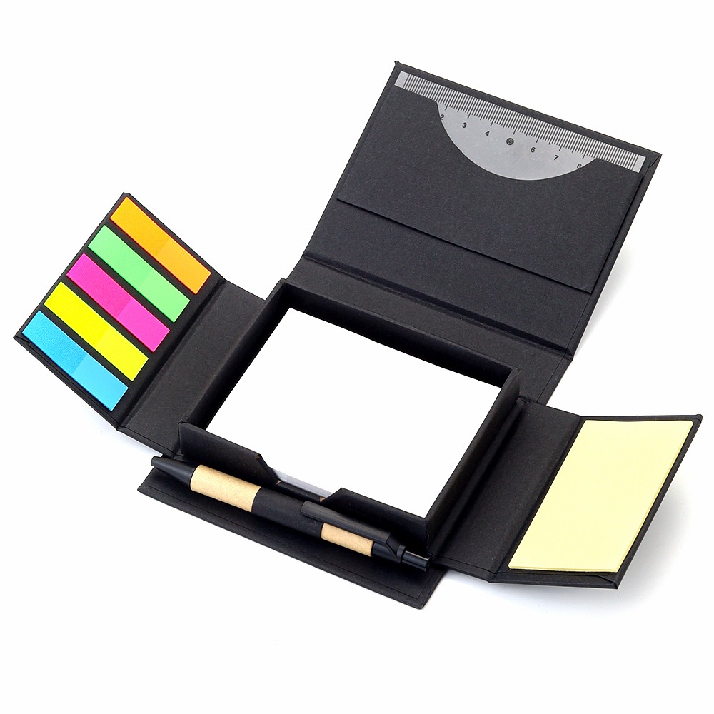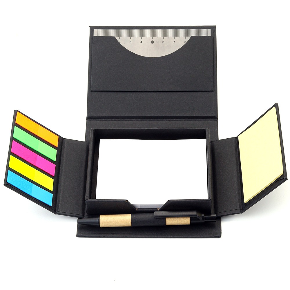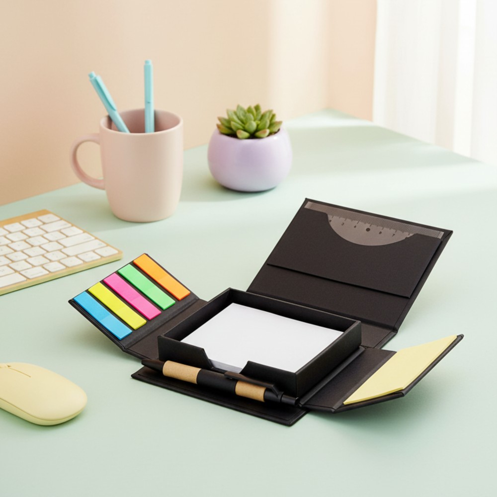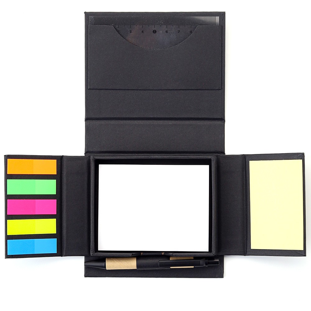Набор для записей со стикерами Notora — стильный и экологичный комплект для продуктивной работы и учебы. В компактном футляре из переработанного черного картона вы найдете разноцветные стикеры, бумагу для заметок, линейку и ручку — всё необходимое для удобного планирования и творчества в одном наборе. 11,5*10,2*2,9 - размер в сложенном виде, 25,5*22 см - размер в разложенном виде. Состав набора: - линейка: 10 см, - ручка, - бумажный блок для записей: 100 листов, - малые стикеры с клеевым краем пяти цветов: 5х10 листов, - бумажный мини-блок для записей с клеевым краем: 15 листов.