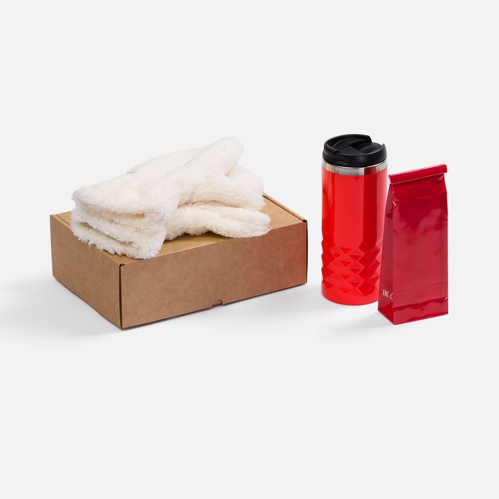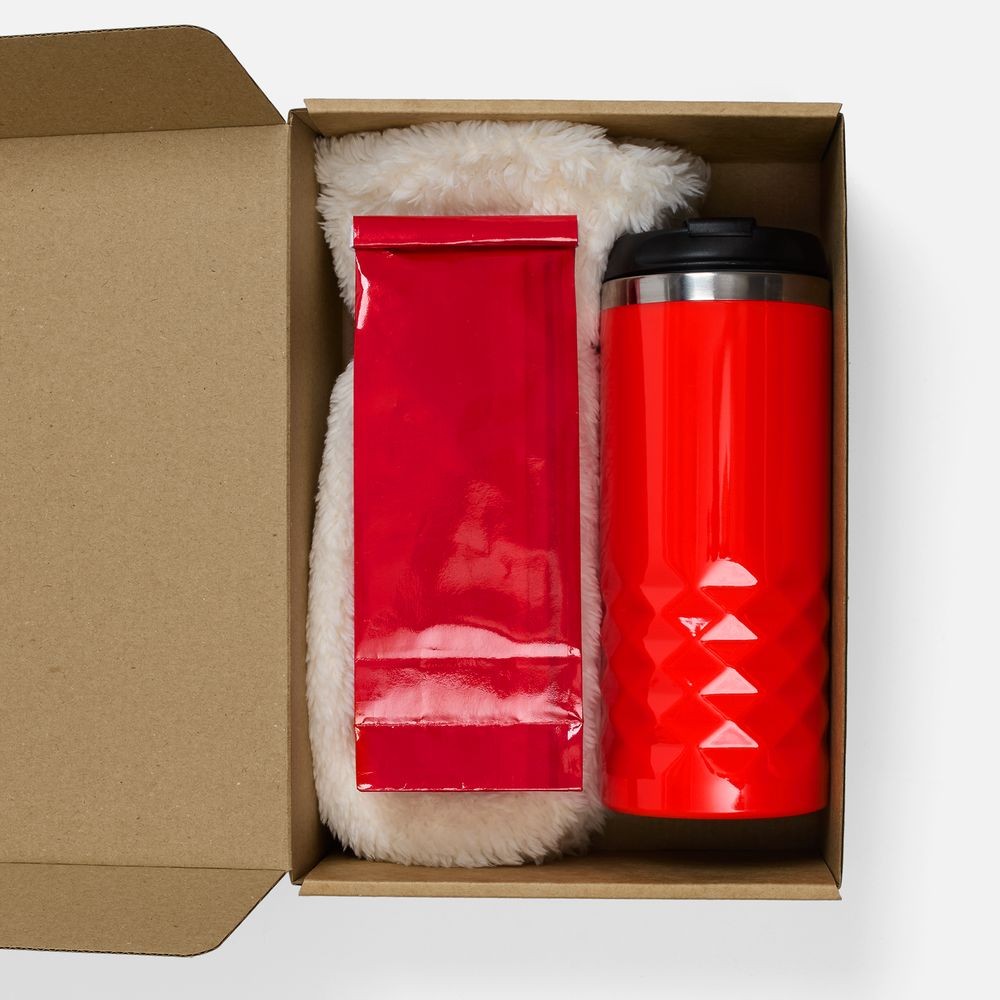 Материал: термостакан, крышка - пластик; внутренняя стенка - нержавеющая сталь; варежки - полиэстер 100%, плотность 280 г/м², длинноворсовый флис; коробка - микрогофрокартон