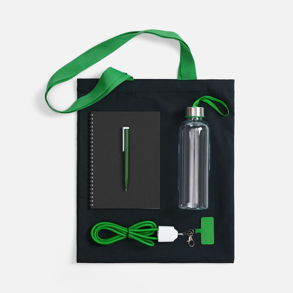 Материал: сумка - хлопок, 240 г/м²; ручки - полиэстер; кабель-ланьярд - нейлон, пластик; металл; бутылка - пластик, пищевой; крышка - металл, пластик; блокнот - бумага, картон; ручка - пластик