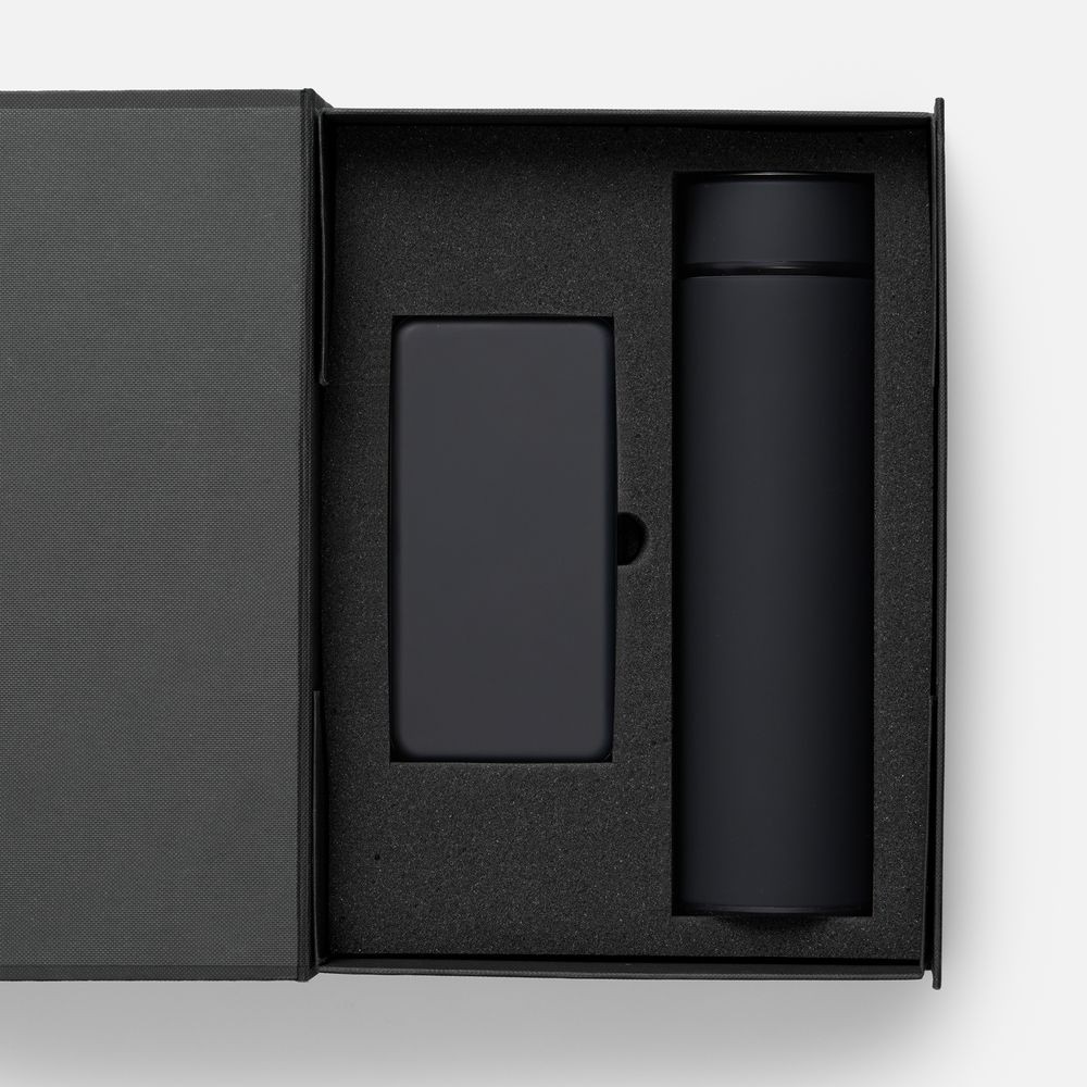 Материал: аккумулятор - пластик; покрытие софт-тач; термос - нержавеющая сталь, 304; покрытие софт-тач; коробка - переплетный картон