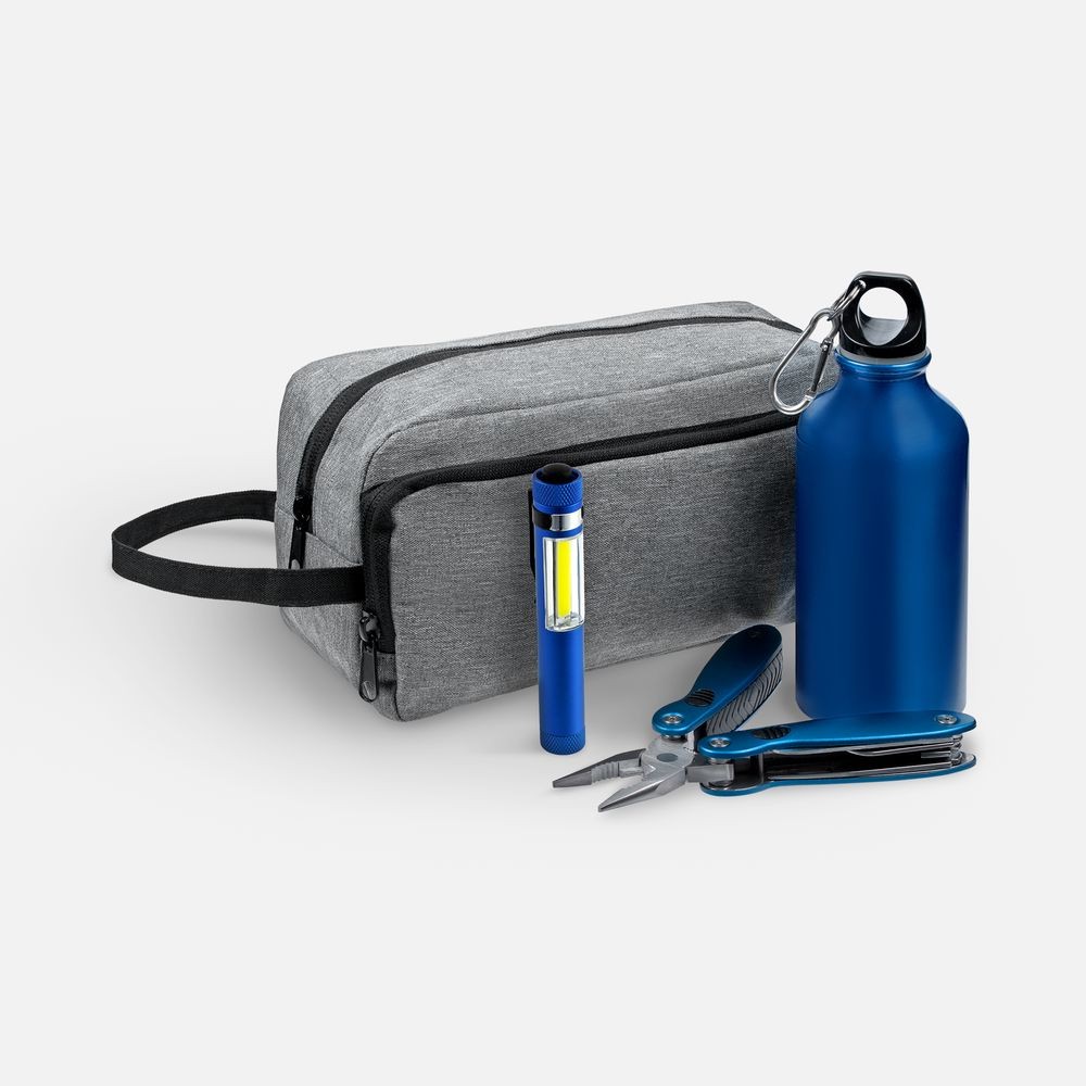 Материал: мультитул, фонарик, бутылка - алюминий; несессер - полиэстер