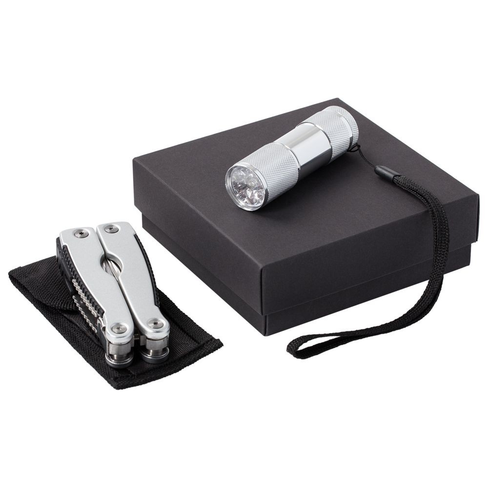 Материал: фонарик - алюминий; мультитул: инструменты - нержавеющая сталь; рукоятки - алюминий; чехол - полиэстер; коробка - картон