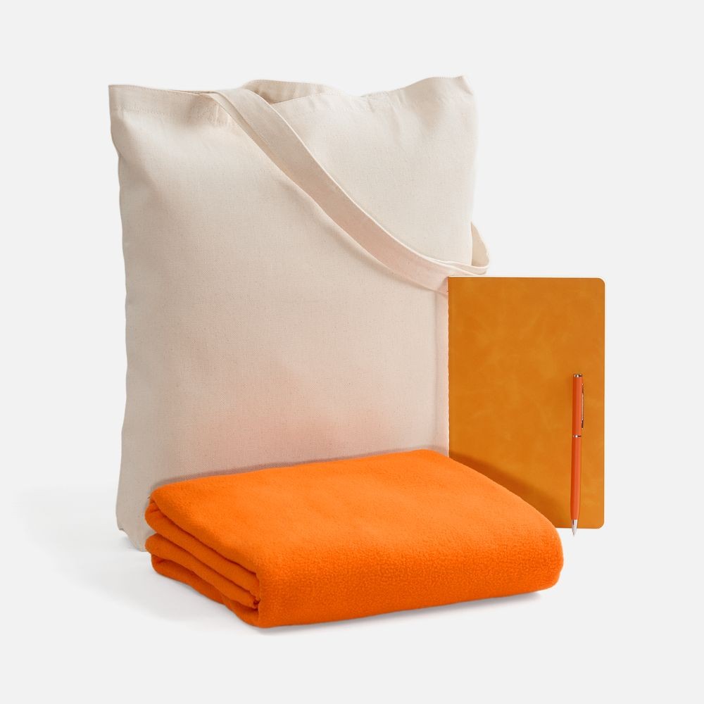Набор с основной канцелярией и пледом — классика жанра в уютном исполнении. С компактным блокнотом под рукой будет удобно делать заметки в любое время, а легкий флисовый плед позволит выразить самые теплые пожелания.