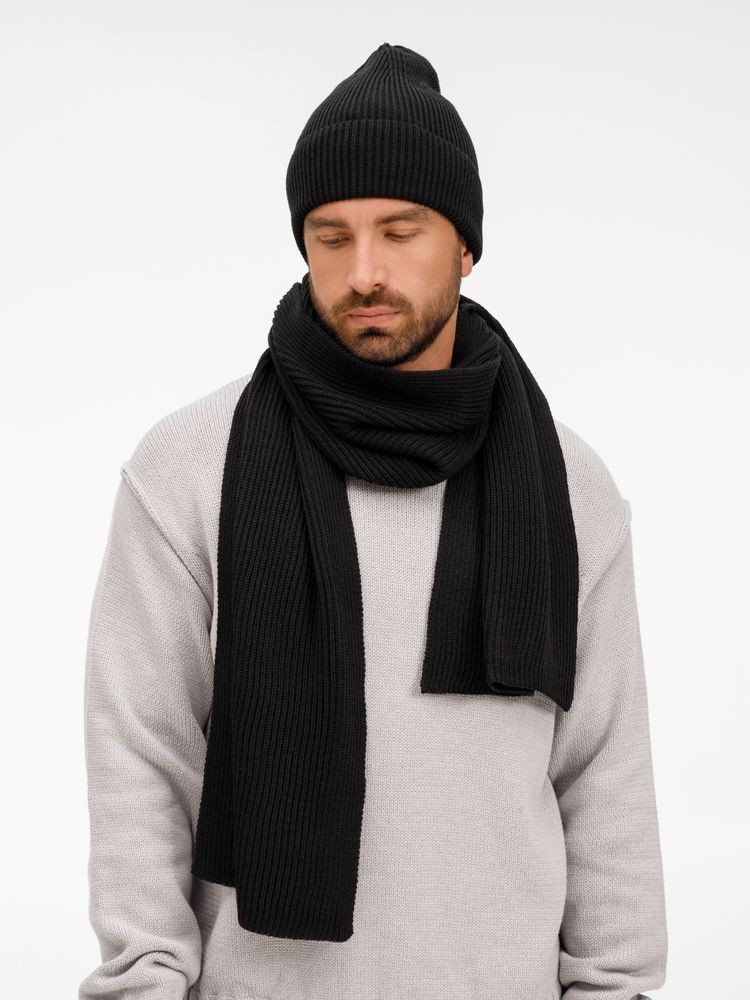 Удлиненная шапка с широким отворотом и фактурной вязкой мягко облегает голову, создавая элегантный силуэт. Широкий шарф с выразительным рельефом позволяет экспериментировать с драпировками, добавляя образу объем и динамику. Перчатки с аккуратной резинкой на манжете обеспечивают идеальную посадку и тактильный комфорт.