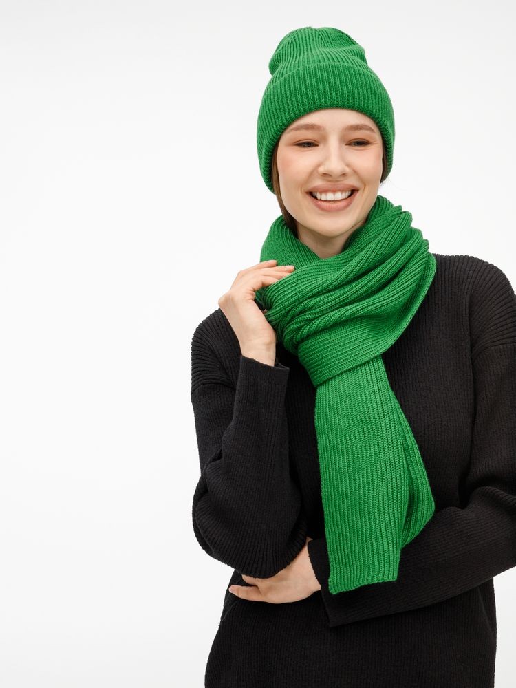 Удлиненная шапка с широким отворотом и фактурной вязкой мягко облегает голову, создавая элегантный силуэт. Широкий шарф с выразительным рельефом позволяет экспериментировать с драпировками, добавляя образу объем и динамику. Перчатки с аккуратной резинкой на манжете обеспечивают идеальную посадку и тактильный комфорт.