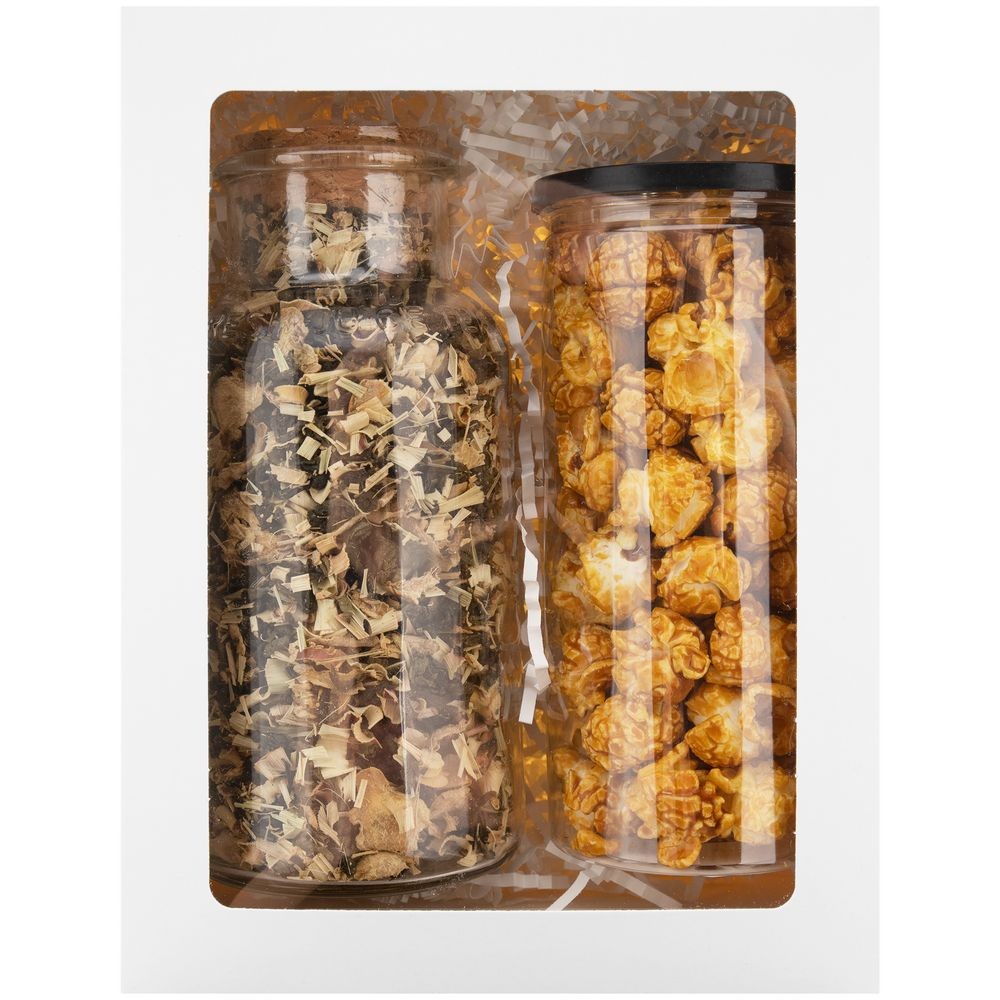 Материал: коробка - картон; упаковка попкорна - пластик; упаковка чая - стекло, пробка