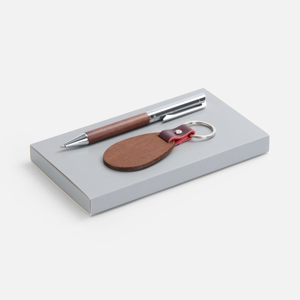 Шариковая ручка в деревянном корпусе и брелок из красного дерева в элегантном подарочном дуэте.