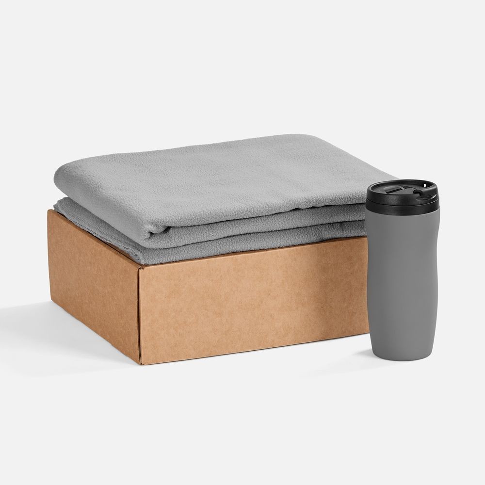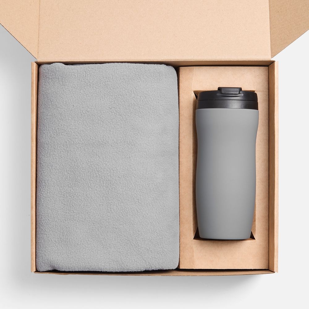 Материал: крышка, внутренняя колба - пластик; корпус - нержавеющая сталь; покрытие софт-тач; плед - флис, плотность 180 г/м²; коробка - микрогофрокартон, Т-23Е