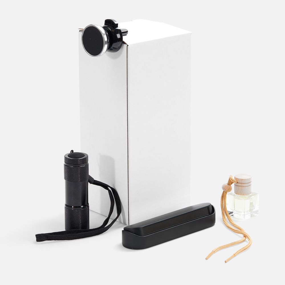 Материал: держатель - АБС-пластик; визитка - пластик; фонарик - алюминий; ароматизатор - стекло, дерево; коробка - микрогофрокартон