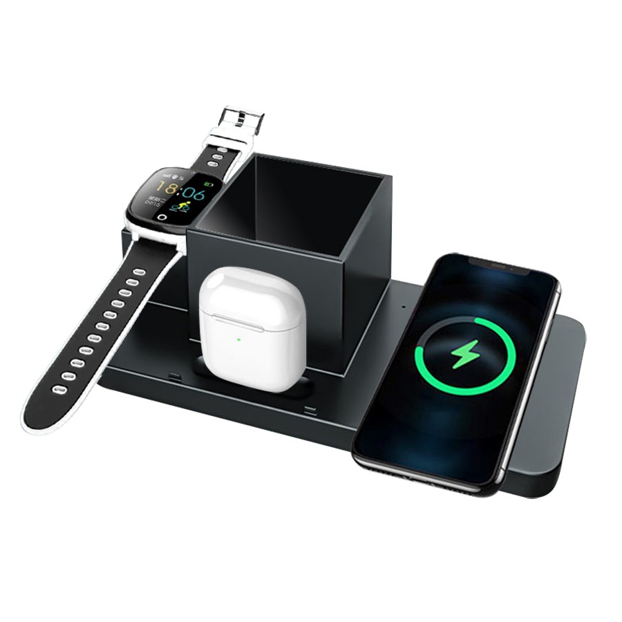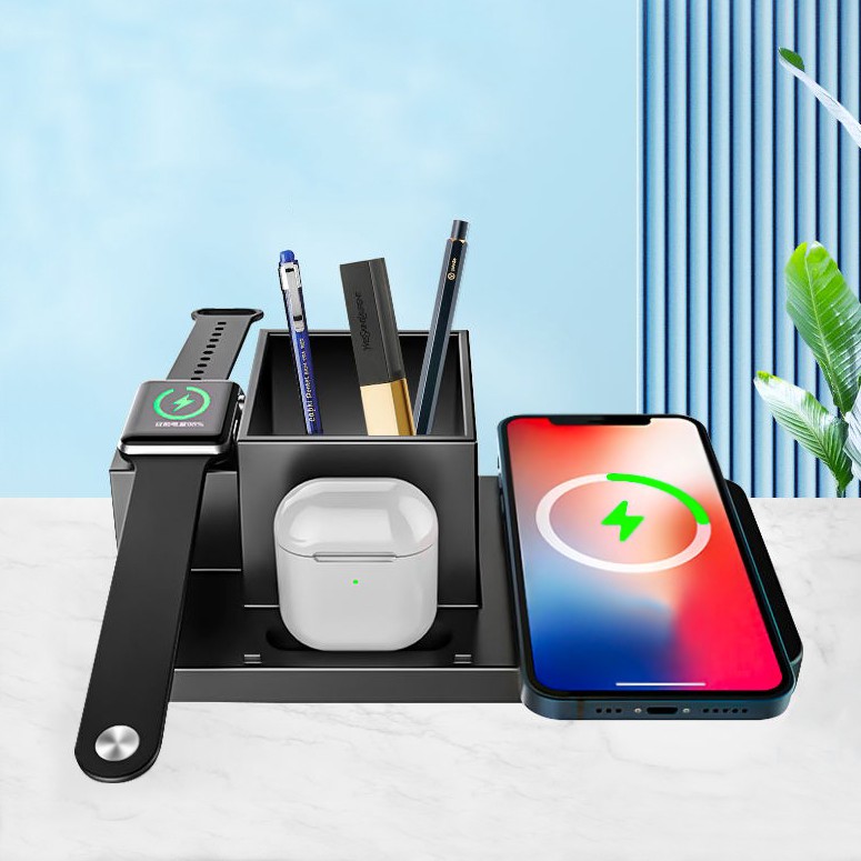 С настольным органайзером Medow вы всегда сможете поддерживать порядок на столе и заряжать свои устройства, не отвлекаясь от работы. Это идеальный аксессуар для современного офиса! Основные характеристики: ✔️ Материал: Пластик ABS, обеспечивающий долговечность и современный внешний вид ✔️ Мощность беспроводной зарядки: 15W, что позволяет быстро и эффективно заряжать ваши устройства ✔️ Разъем: Type-C, что обеспечивает универсальность подключения Настольный органайзер Medow предлагает три области для зарядки аксессуаров, а также удобную подставку для канцелярских принадлежностей. Это делает его идеальным помощником для организации рабочего процесса Технические характеристики: - Входное напряжение и ток:9v-1.6A/5V-2A - Выходное напряжение и ток:9v-1.6A/5V-2A - Мощность беспроводного зарядного:15W - Мощность беспроводного зарядного для часов:3W - Мощность беспроводного зарядного airpods:5W - Магнит: Да. Поддерживаемые устройства: 1) Область зарядки смартфона поддерживает все Android/Ios устройства с функцией беспроводной зарядки. 2) Область зарядки наушников поддерживает все Android/Ios устройства с функцией беспроводной зарядки. 3) Область зарядки часов поддерживает только устройства AppleWatch Для работы беспроводной зарядки необходимо подключать устройство к сети через адаптер.