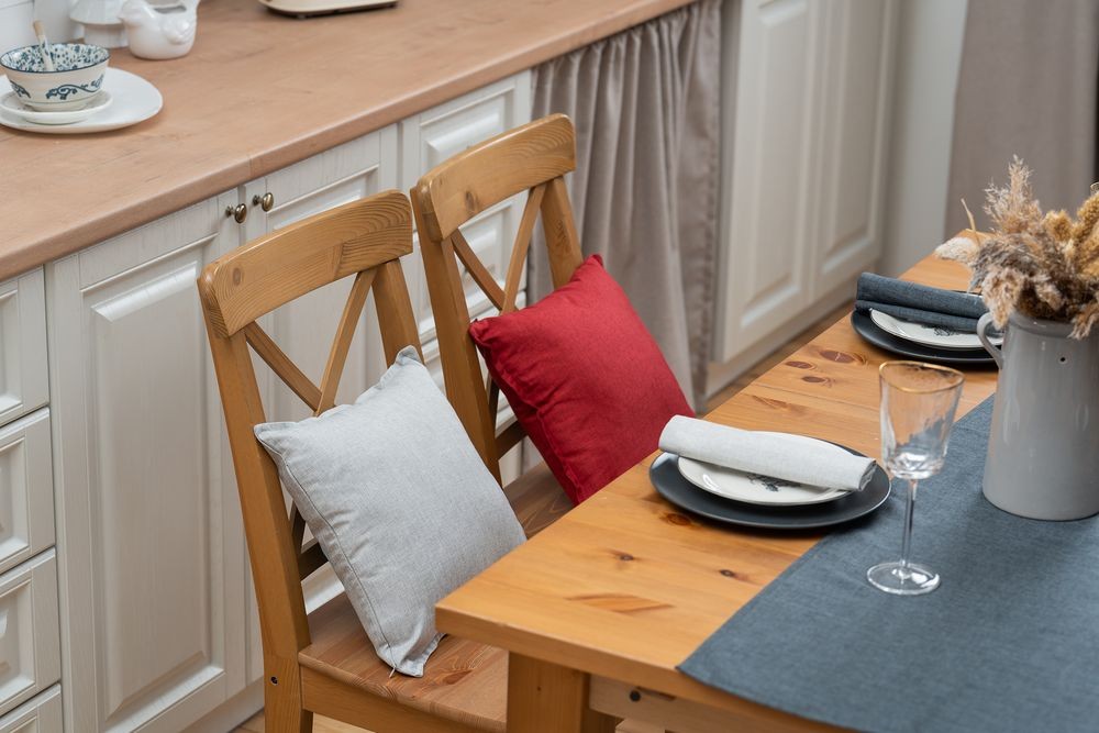 Износостойкая ткань, имитирующая лен, обработана пропиткой от грязи и воды, что делает ее применение для кухни и дома практичным, а уход — легким.