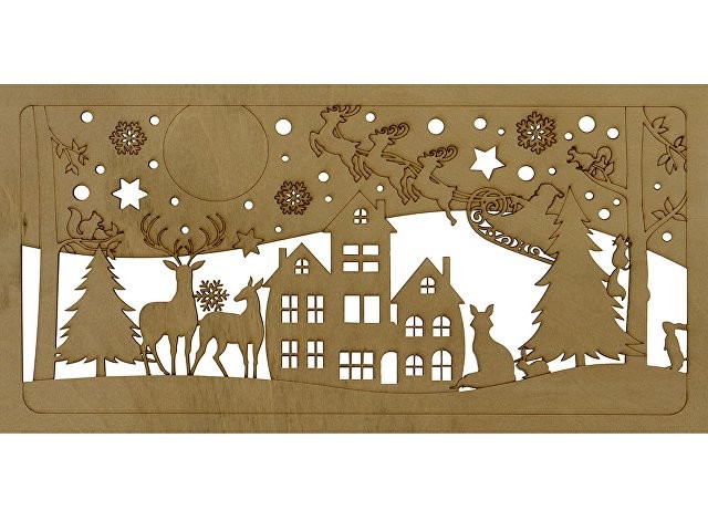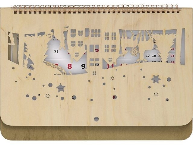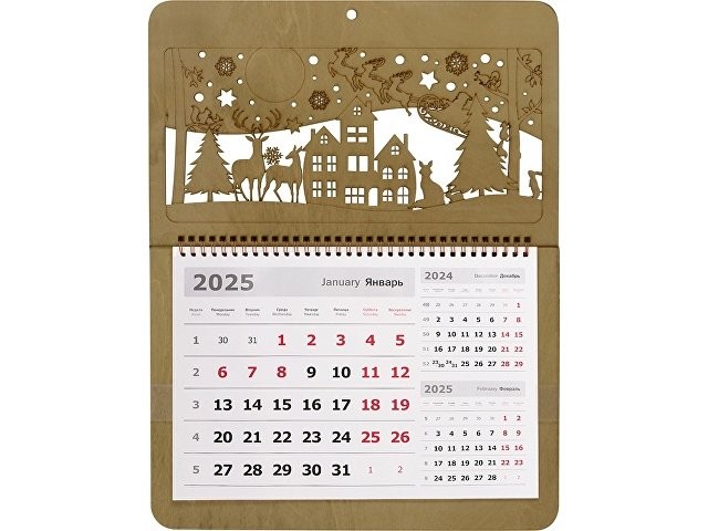 Настенный перекидной календарь имеет необычную «обложку», в роли которой выступают фанерные крышки. Нижняя крышка сплошная, верхняя — резная, ажурная, с вырезанным новогодним пейзажем и большим полем под нанесение логотипа или надписи, которая органично впишется в облик календаря.