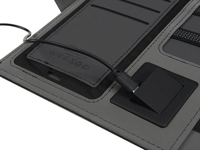 Органайзер «Powernote» — стильный бизнес-подарок, который в полной мере воплощает идею многофункциональности. С его помощью можно заряжать гаджеты как беспроводным способом, так и через кабель, эргономично хранить целый ряд предметов — от ручек и проводов до кредитных карт — и даже делать записи. Элегантность внешнего вида дополняется приятной текстурой обложки из мягкого полиэстера и высоким качеством внутренней отделки с элементами soft-touch покрытия. Практичный и технологичный аксессуар, который в состоянии заменить сразу несколько вещей. - Встроенный пауэрбанк емкостью 5000 мАh. - Возможность зарядки как беспроводным способом, так и через кабель. - Удобная магнитная застежка. - Качественные материалы. - Отделение для телефона. - Блокнот для записей 64л.