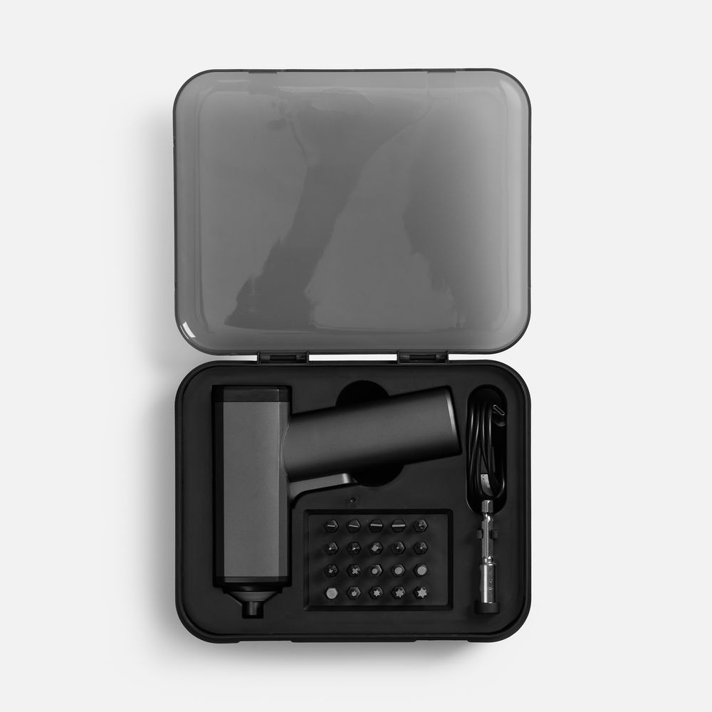 Комплектация: электрическая отвертка, биты (20 шт), удлинитель наконечника, зарядный кабель USB-USB Type-C, бокс для хранения, инструкция.