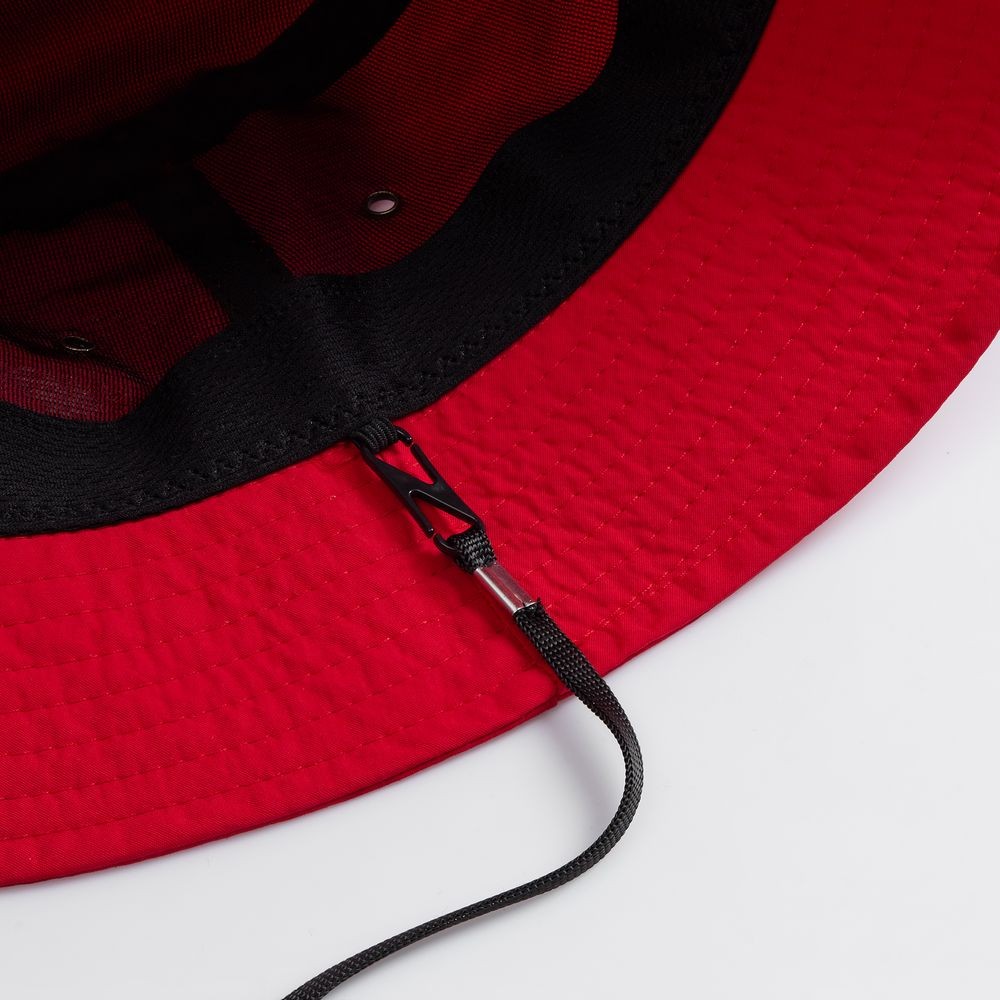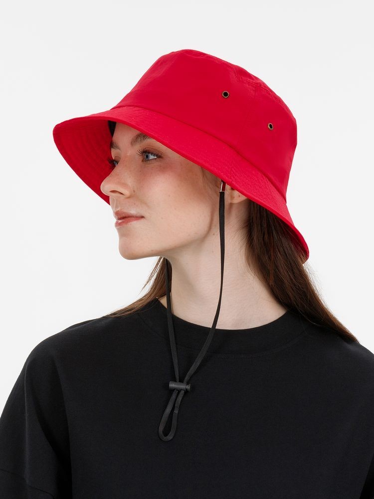 Укрепляющая тесьма на внутренних швах Плотные, широкие простроченные поля, которые держат форму Отверстия с металлическими люверсами обеспечивают хорошую вентиляцию Шнур с утяжкой для надежной фиксации панамы на голове Шнур съемный, крепится на пластиковые карабины Длина шнурка — 30 см
