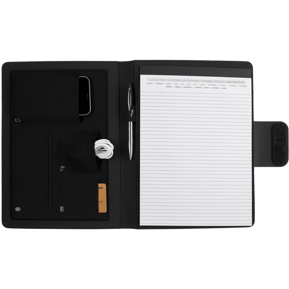 Карман для компьютерной мышки (15х7,5 см) Карман для карточек (8х6 см) Карман для провода (7,5х7,5 см) Карман для телефона (14х8,5 см) Петля для ручки Съемный блокнот формата А4, 20 листов в линейку из белой бумаги, плотностью 80 г/м² Батарейка типа CR2032(для подсветки гравировки с логотипом) в комплекте Шильдик на клапане с подсветкой.