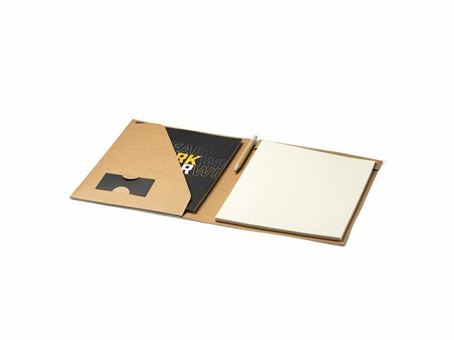 Папка из переработанного картона. Съемный блокнот на 20 листов, ручка в тон из пшеничного волокна, внутренний карман и картхолдер в комплекте.
