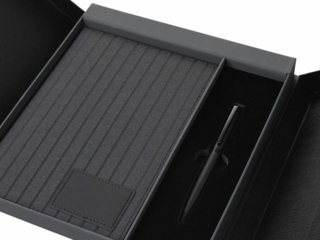 "Bradbury & Co" - это элегантный подарочный набор, упакованный в красивую коробку на магните. Внутри — блокнот в обложке из рифленой экокожи и металлическая шариковая ручка. Ручка гармонирует с блокнотом за счет рифленой нижней части, а блокнот имеет специальный патч для нанесения логотипа (который можно также нанести на более ровную поверхность на обороте блокнота) и ляссе-закладку для удобства. При гравировке на ручке вскрывается эффектный серебристый цвет.