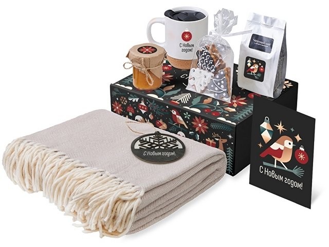 Материал: плед - 100% хлопок; кружка - керамика, пробка; подвеска - дерево; открытка - бумага