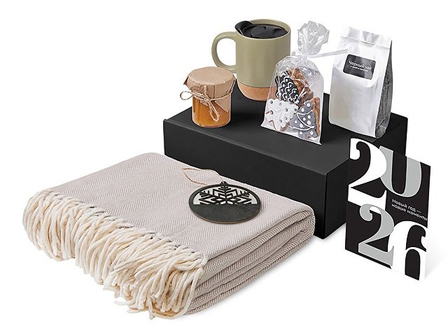 Материал: плед - 100% хлопок; кружка - керамика, пробка; подвеска - дерево; открытка - бумага