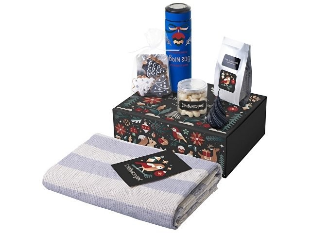 Подарочный набор c пледом, термосом, свечой и миндалем, синий