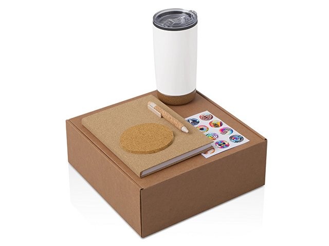 Набор " Earthly"— стильный и экологичный подарок, который сочетает практичность и заботу о природе. Такой набор отлично подойдёт сотрудникам, клиентам и партнёрам, которые ценят экологичность и практичность. Блокнот выполнен из пробки - натурального и быстровозобнавляемого материала для записи экологичных идей, заметок и планов на день; Ручка из пробки и переработанной пшеницы, которая всегда под рукой; Термокружка с двойными стенками дополнена непротекаемой прозрачной пластиковой крышкой-слайдером, которая позволяет дополнительно защитить напиток от остывания. Пробковое основание обеспечивает кружке мягкую и бесшумную посадку. Костеры из пробки подойдут для самой разной посуды: большой диаметр и универсальная форма делают его совместимым с бокалами, стаканами и кружками различных объемов. В набор входит 4 костера, упакованных в хлопковый мешочек на шнурке. И подставки, и упаковка набора выполнены из натуральных материалов; Набор стикеров — для ярких акцентов и персонализации вещей. Универсальный ложемент обеспечивает аккуратное размещение и надёжную фиксацию элементов, делая набор эффектным и презентабельным при вручении. Дополнительное преимущество — набор доступен в конструкторе наборов: компоненты можно заменить и собрать индивидуальный вариант под стиль компании или вкусы получателя.