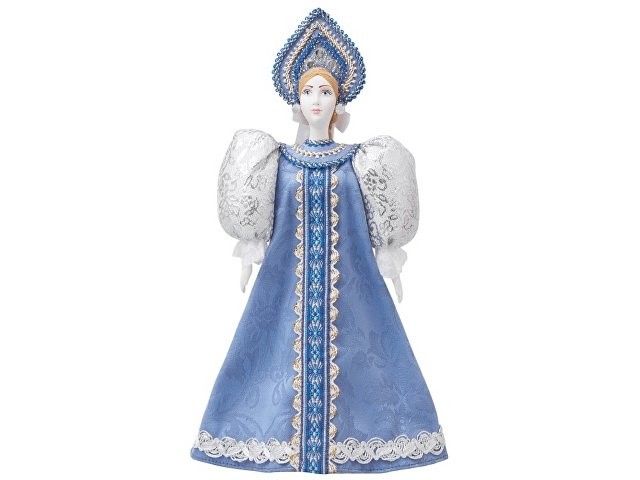 - Фарфоровая кукла в народном костюме: ручная работа, украшенная детализированным голубым сарафаном, воздушными белыми рукавами и нарядным кокошником с узорами. Кукла воплощает эстетику старинных русских праздников.