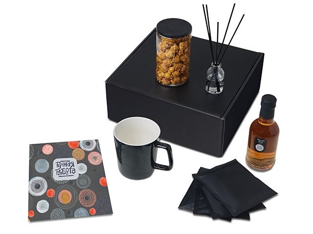 Материал: диффузор - стекло, кофе в дрип пакете - пластик, кружка - костяной фарфор, попкорн - пластик, металл, мешок - нетканый материал (спанбонд), коробка - картон