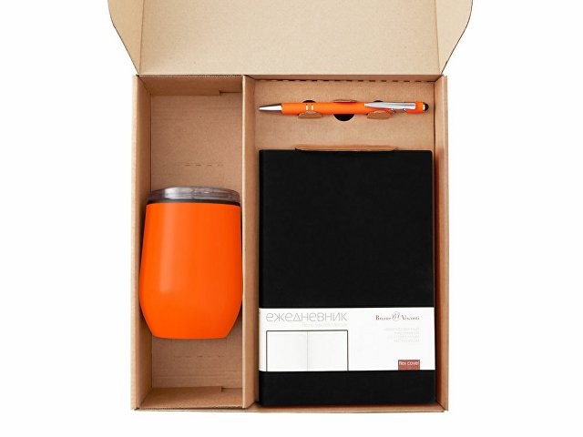 Материал: ежедневник - искусственная кожа, термокружка - нержавеющая сталь снаружи, полипропилен внутри, ручка - металл c покрытием soft-touch, ситечко - нержавеющая cталь