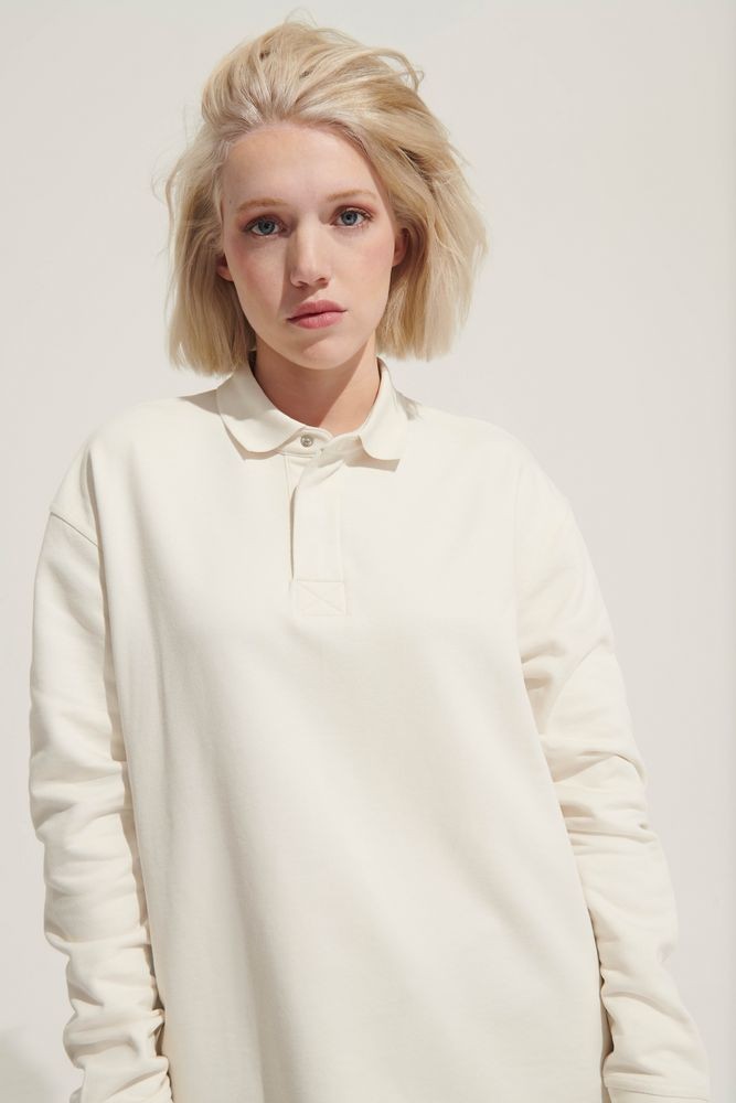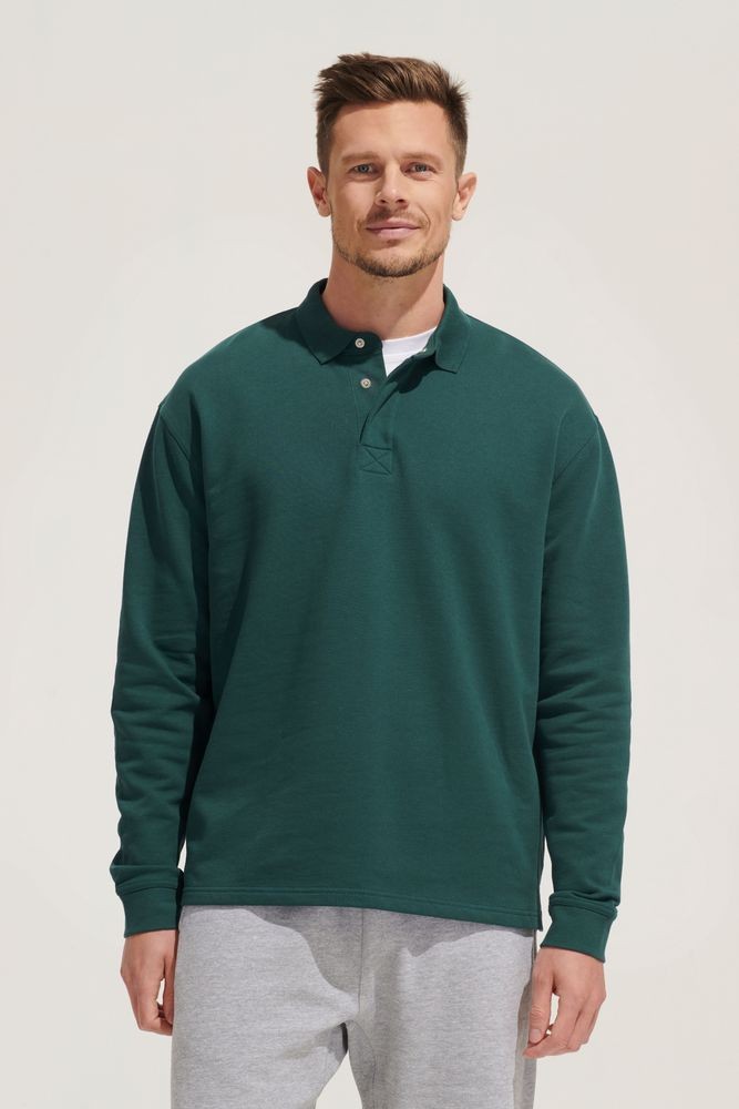 Рубашка поло из футера с длинным рукавом и спущенным плечом.