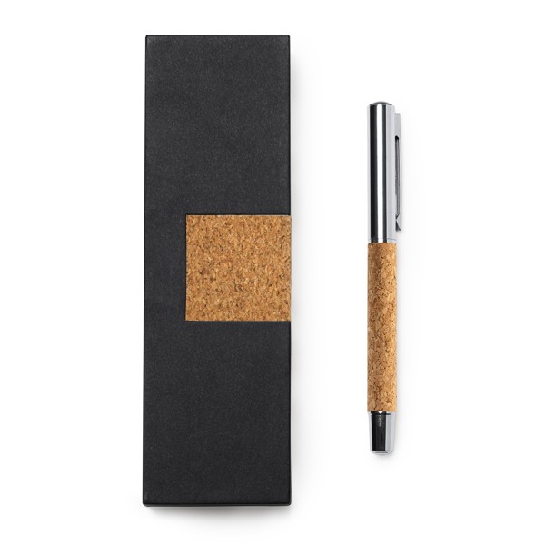Рекламная ручка-роллер из натуральной пробки и стали. Представлена в элегантном комбинированном футляре из пробки с мягкой внутренней подкладкой.
