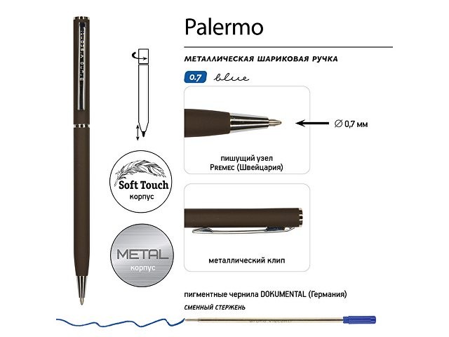 Автоматическая металлическая ручка "Bruno Visconti" серии "Palermo" однотонного цвета порадует любителей всего изящного и утонченного. Покрытие корпуса Soft Touch гарантирует дополнительный комфорт в работе с ней. Стержень легко выдвигается благодаря поворотному механизму. Синие пигментные чернила Dokumental (Германия) и пишущий узел Premec (Швейцария) обеспечивают качественное и мягкое письмо.