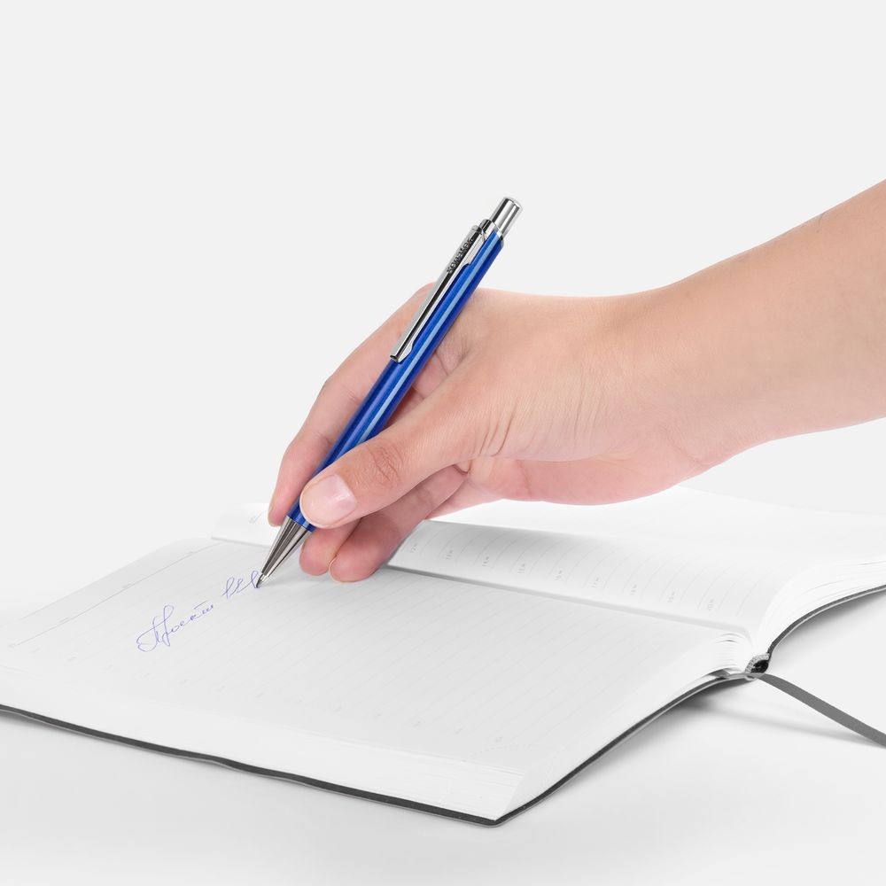 Механизм ручки: нажимной Корпус ручки разбирается, стержень легко заменить.  Стержень с синими чернилами. Гравировка по цветным частям корпуса получается серебристой.