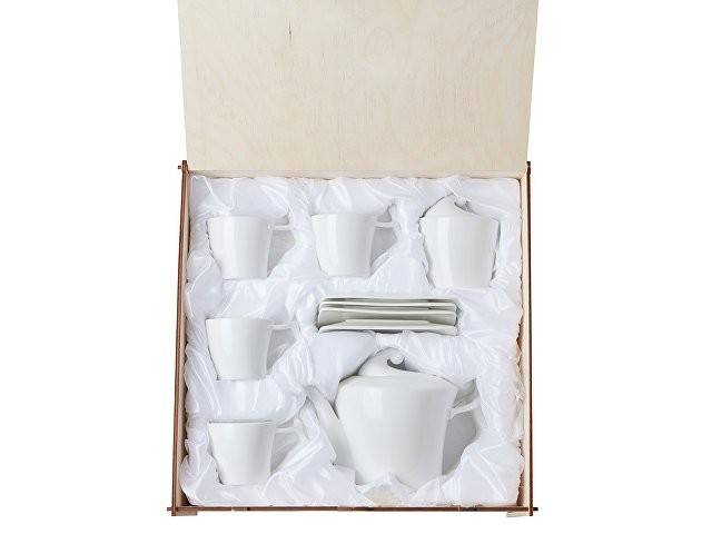 Сервиз поставляется в деревянной коробке. Вы можете нанести на нее логтип или памятную надпись. Это готовая идея для безупречного корпоративного подарка.