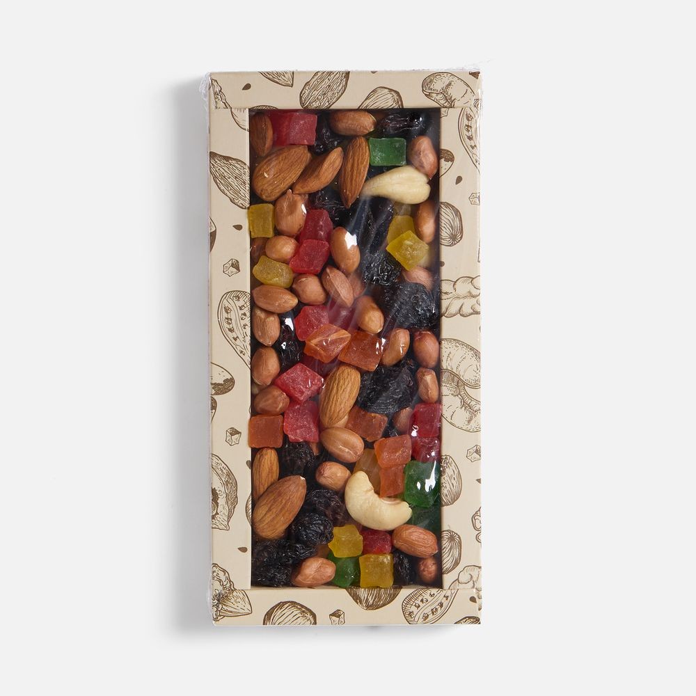 Состав: миндаль, кешью, изюм темный, арахис очищенный, цукаты из ананаса.